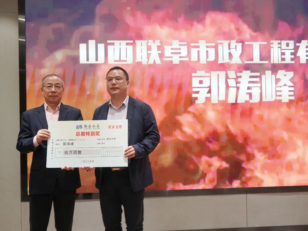 俞總作總結(jié)發(fā)言 會上,俞總向大家分析了當(dāng)前國內(nèi)外經(jīng)濟(jì)形勢,分析了行業(yè)趨勢,提出在新的一年,聯(lián)合水務(wù)將開啟新的發(fā)展征程。2023年,我們將面臨新的環(huán)境要求,我們要充分發(fā)揮新的平臺優(yōu)勢,緊緊圍繞“主業(yè)清晰、業(yè)績增長、運(yùn)營高效”的企業(yè)價值目標(biāo),勵精圖治,高質(zhì)量提升存量業(yè)務(wù),切實(shí)完成業(yè)績目標(biāo),不斷提升管理效率,運(yùn)營好現(xiàn)有傳統(tǒng)水務(wù)業(yè)務(wù)。同時,要奮發(fā)有為,高質(zhì)量發(fā)展增量業(yè)務(wù),開發(fā)優(yōu)質(zhì)項目和戰(zhàn)略業(yè)務(wù)。我們要聚焦主業(yè),強(qiáng)化科技支撐,輕重業(yè)務(wù)結(jié)合,國內(nèi)與海外發(fā)展;我們也將研究并審慎評估“水務(wù)+”新興領(lǐng)域,充實(shí)業(yè)務(wù)版塊,增強(qiáng)管理團(tuán)隊。 最后,俞總強(qiáng)調(diào),我們要堅持“團(tuán)結(jié)、誠信、拼搏、共贏”的企業(yè)精神,在2023年的工作中勵精圖治,奮發(fā)有為,為開啟聯(lián)合水務(wù)發(fā)展新征程、實(shí)現(xiàn)聯(lián)合水務(wù)高質(zhì)量發(fā)展而努力奮斗。 會議為建設(shè)管理中心副總經(jīng)理兼任山西聯(lián)卓市政工程有限公司總經(jīng)理郭濤峰頒發(fā)了“2022年度總裁特別獎”。2022年,郭總兢兢業(yè)業(yè)、勤懇奉獻(xiàn),率領(lǐng)聯(lián)卓公司建設(shè)團(tuán)隊出色完成了業(yè)績?nèi)蝿?wù),為提升聯(lián)合水務(wù)經(jīng)營業(yè)績和項目建設(shè)做出了貢獻(xiàn)。
