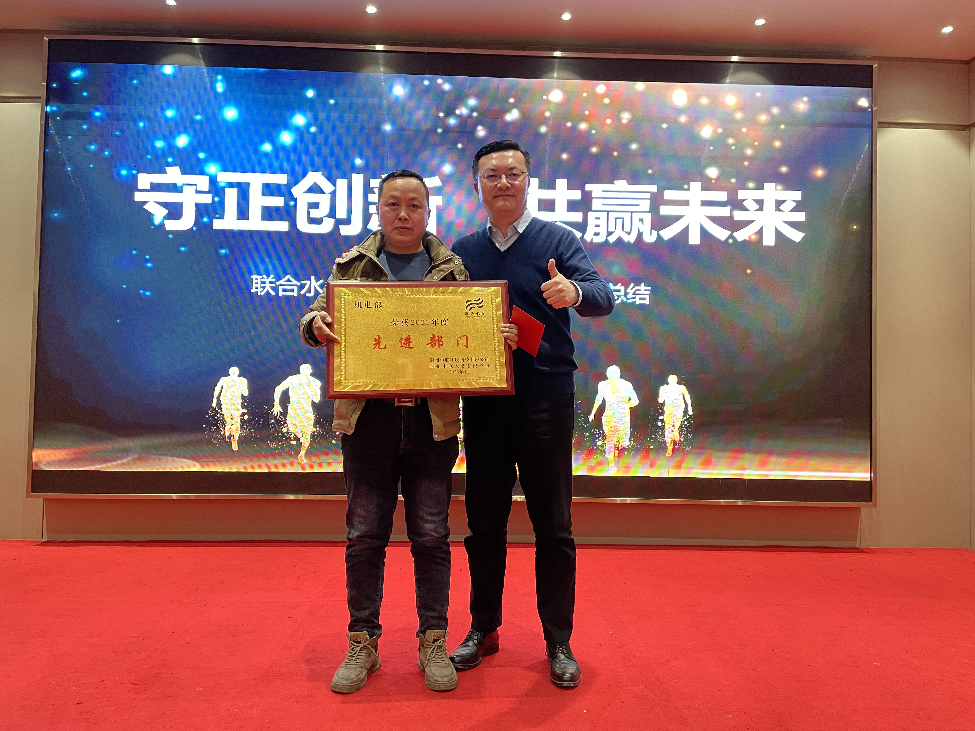 瑞虎辭舊歲,玉兔迎新春。2023年1月12日,聯(lián)合水務(wù)荊州公司2022年工作總結(jié)暨表彰大會圓滿召開。聯(lián)合水務(wù)常務(wù)副總裁劉猛、高級副總裁陳樵、人力資源部總經(jīng)理楊麗霞、副總裁助理黃露親臨大會現(xiàn)場,荊州公司總經(jīng)理鄭彬、湖北區(qū)域財務(wù)總監(jiān)魏芬以及全體員工參加了會議,會議由荊州公司人力資源經(jīng)理鄒玉珍主持。會上,回顧了過去一年的工作,總結(jié)經(jīng)驗、分析不足,對新一年的工作把舵定調(diào)。同時,本次大會對2022年度先進部門及先進員工進行了表彰和獎勵。