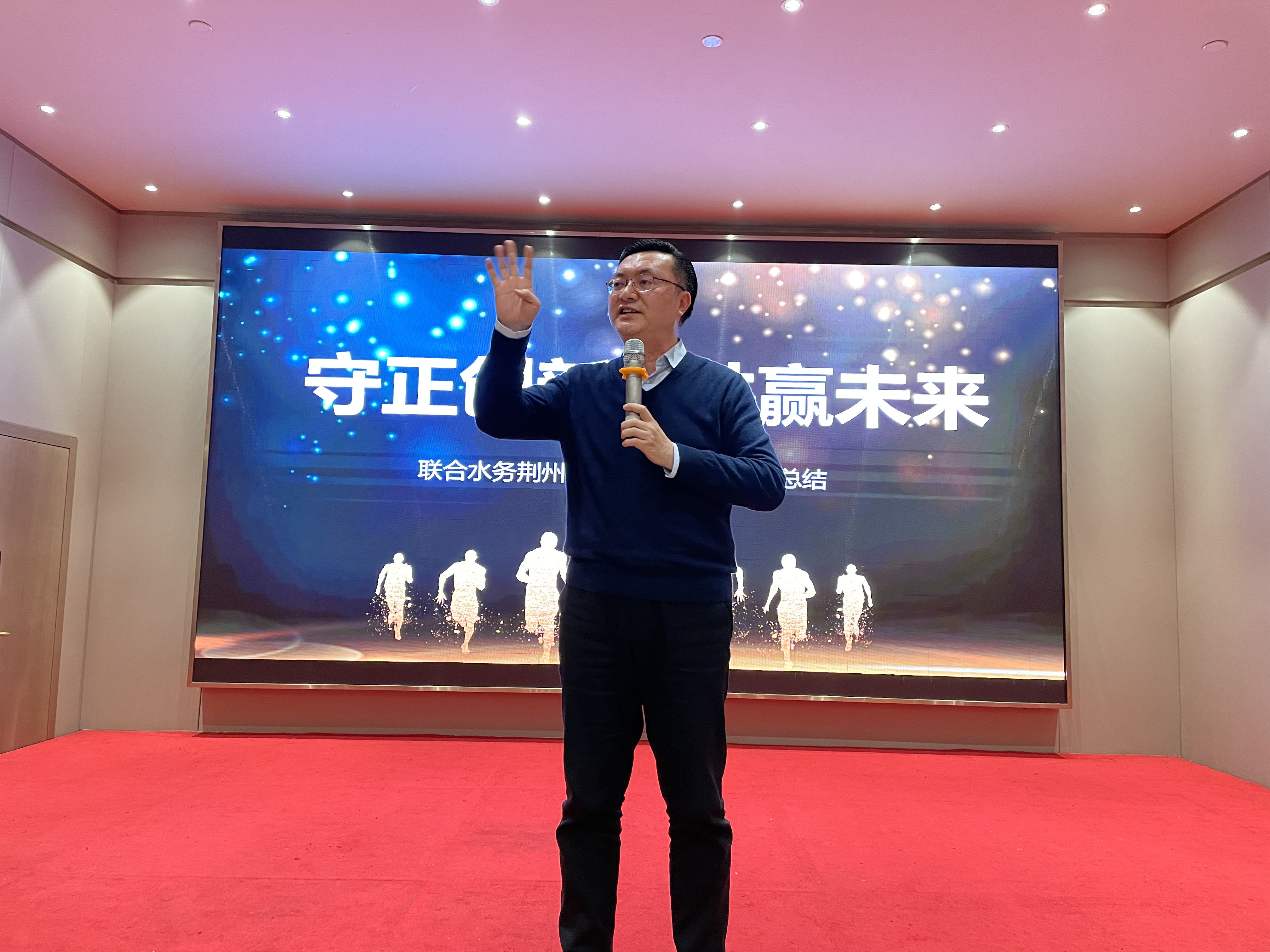 圖:陳總作重要講話 會議最后,聯(lián)合水務(wù)常務(wù)副總裁劉猛發(fā)表了總結(jié)講話。2022年疫情期間,荊州公司管理層率先垂范,帶頭駐廠堅守崗位,保證了污水處理廠的安全運行,出水達標,為園區(qū)環(huán)保事業(yè)發(fā)展做出了應(yīng)有的貢獻;提標改造項目團隊積極克服多項困難,計劃2023年4月中旬完成提標改造工程建設(shè);水環(huán)境團隊不辱使命,北護城河以及江津湖治理都已初見成效;荊州公司堅持誠信經(jīng)營、嚴守合同,獲得了市級“守合同重信用企業(yè)”榮譽。對于荊州公司在2022年的努力和所取得成績,劉總給予了高度肯定。2023年是充滿機遇與挑戰(zhàn)的一年,無論是從國家發(fā)展形勢,還是從荊州市發(fā)展形勢來看,均是利好的,劉總希望荊州公司全體員工抓住機遇,勇于開拓,守正創(chuàng)新,積極創(chuàng)收,助力荊州事業(yè)再創(chuàng)輝煌。