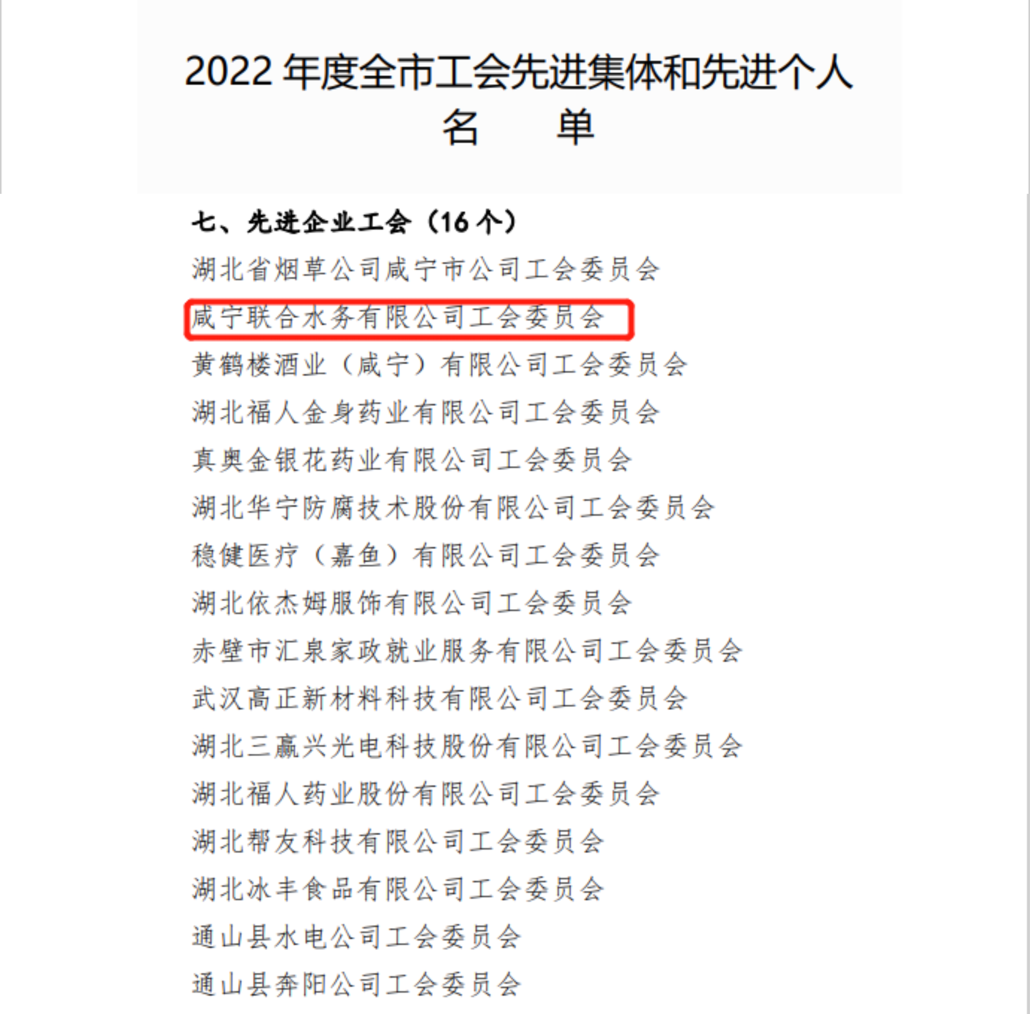 | 咸寧聯(lián)合水務(wù)榮獲“2022年度全市工會(huì)先進(jìn)集體”榮譽(yù)稱(chēng)號(hào) | ||