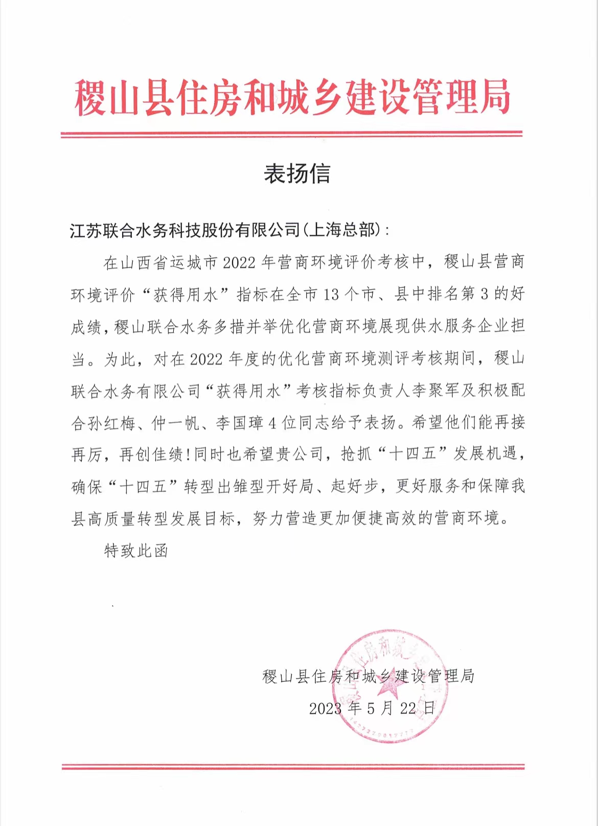 近日,山西省稷山縣住房和城鄉(xiāng)建設(shè)局向聯(lián)合水務(wù)發(fā)來一封表揚信,充分肯定了江蘇聯(lián)合水務(wù)科技股份有限公司旗下全資子公司稷山聯(lián)合水務(wù)有限公司在優(yōu)化營商環(huán)境方面所采取的多項舉措,贊揚其追求卓越,以高度責(zé)任感展現(xiàn)了供水服務(wù)企業(yè)擔(dān)當(dāng),信中特別表揚了稷山公司“優(yōu)化營商”小組成員,包括客戶服務(wù)經(jīng)理李聚軍、客戶服務(wù)部副經(jīng)理孫紅梅、管網(wǎng)部經(jīng)理仲一帆、項目部經(jīng)理李國璋,希望他們能再接再厲,再創(chuàng)佳績!