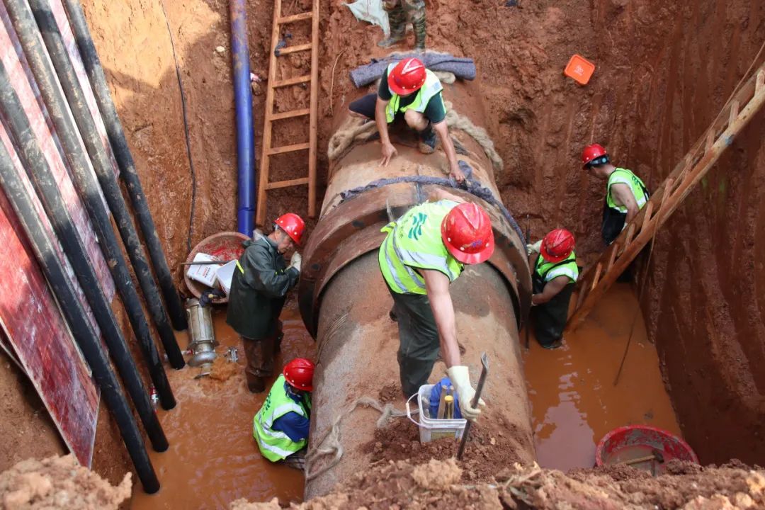 無懼“高”溫,做好應急搶修 夏季作為一年之中的用水高峰期,季節(jié)的特殊性使得管道爆管、漏水現(xiàn)象發(fā)生頻率較高,供水管道搶修量比其他時間段明顯增加。7月12日,通江大道大屋吳附近DN1200mm供水管網(wǎng)因老化發(fā)生漏水,咸寧聯(lián)合水務多部門聯(lián)動火速趕赴現(xiàn)場了解情況,并迅速啟動應急搶修預案,第一時間緊急調(diào)配挖掘機、發(fā)電車、抽水機等大型搶修機具進行增援,安排應急搶修專班趕往事發(fā)現(xiàn)場,迅速開展現(xiàn)場勘察、確定漏點具體情況、設立全面安全防護措施等搶修前期工作。在搶修期間,面對管徑大、時間緊、施工作業(yè)環(huán)境復雜等諸多難題,搶修人員齊心配合、攻堅克難,井然有序地開展漏點測定、降水開挖、焊接維修、沖洗試壓等一系列搶修和恢復工作,天氣炎熱,施工人員早已汗流浹背,但他們不畏艱難酷暑,堅守崗位,歷經(jīng)三十六個小時的晝夜奮戰(zhàn),完美完成DN1200主管道的維修和保養(yǎng),未對城區(qū)供水造成任何不良影響。