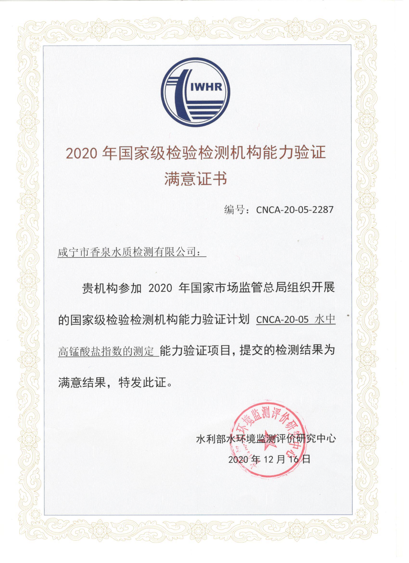咸寧市香泉水質(zhì)檢測有限公司為江蘇聯(lián)合水務(wù)科技股份有限公司(股票代碼:603291.SH)的全資子公司,成立于2018年6月,公司于2019年1月通過省級檢驗檢測機構(gòu)CMA資質(zhì)認定,同年被湖北省住建廳審核確認為湖北省城市供水水質(zhì)監(jiān)測網(wǎng)咸寧監(jiān)測站,現(xiàn)具有生活飲用水、地表水及水處理劑等三類產(chǎn)品106個項目的檢測資質(zhì),檢測能力處于湖北省同行業(yè)較為先進水平,是咸寧市生活飲用水檢測領(lǐng)域資質(zhì)最全的專業(yè)檢測機構(gòu)之一。據(jù)統(tǒng)計,聯(lián)合水務(wù)香泉水檢公司自成立以來,先后參加國家級或省級質(zhì)控考核和能力驗證8項次,結(jié)果合格(滿意)率達到100%。