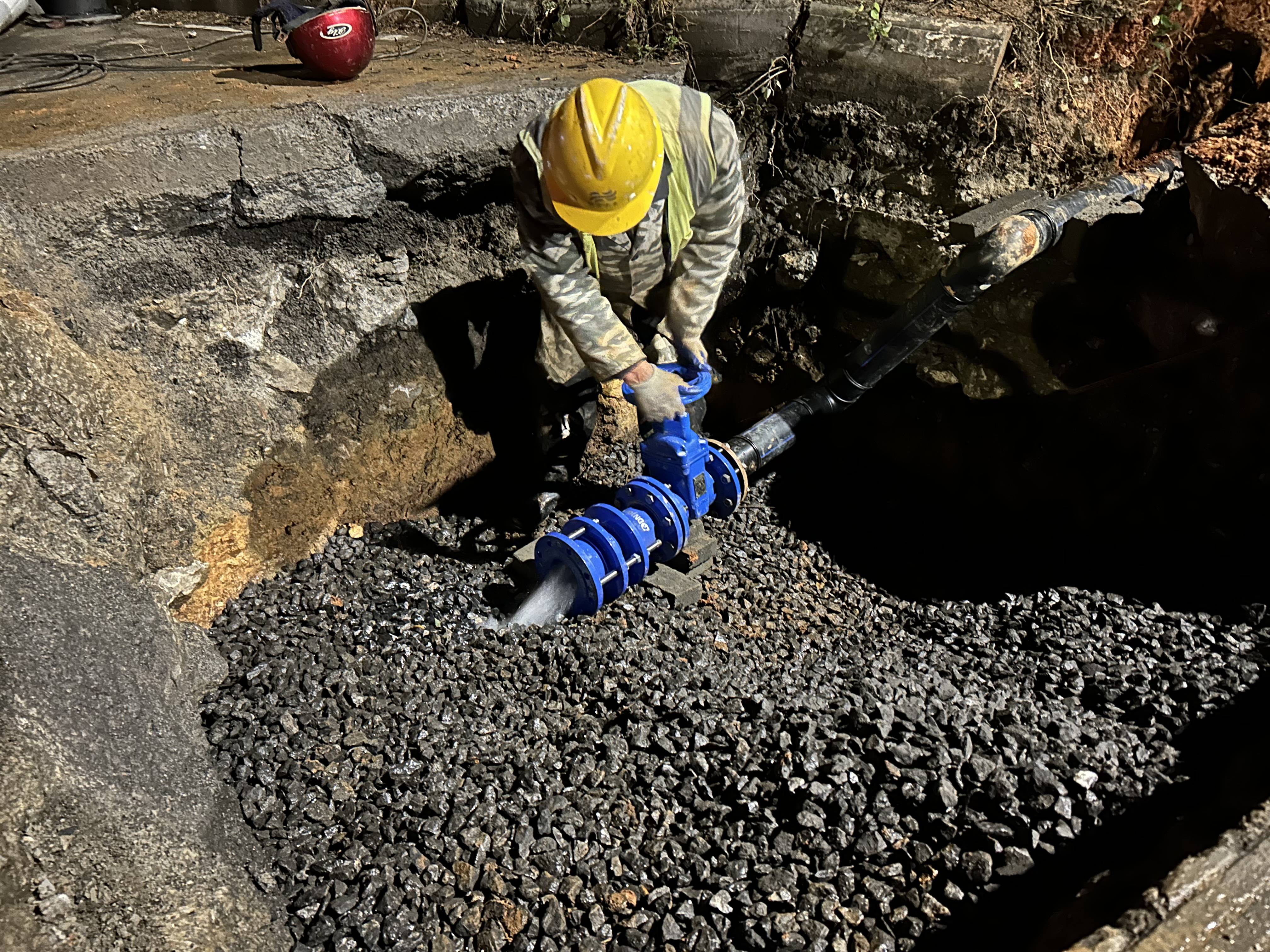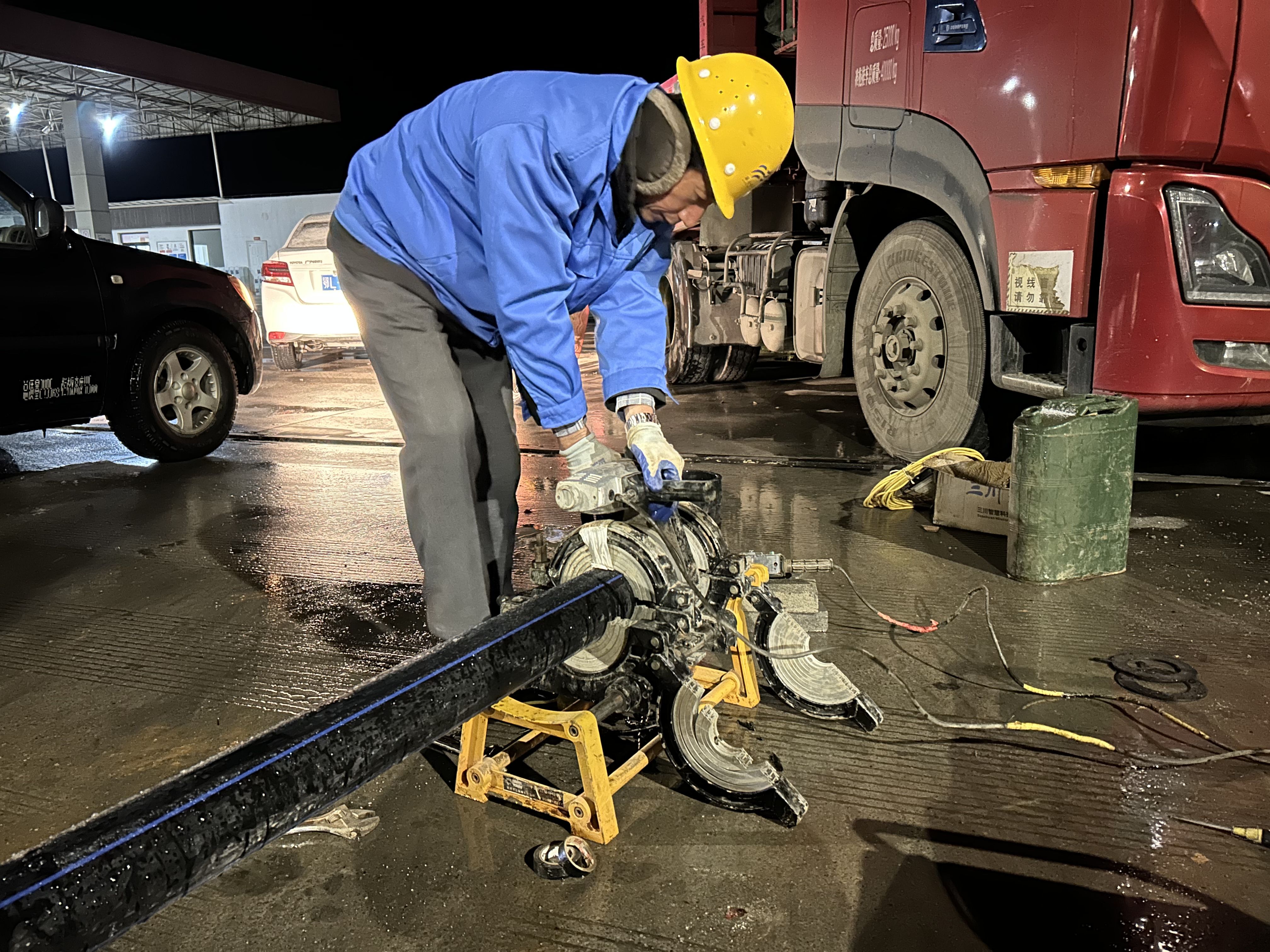 在“人、材、機(jī)、料”全部到位后,工作人員按照原定施工計(jì)劃開始施工。工程部和管網(wǎng)部同事先關(guān)閉距碰通處三千米處,巨寧大道咸安大道交匯處的DN300閥門。在管網(wǎng)部關(guān)閉閥門,確認(rèn)閥門無(wú)水后,再打開DN150排污閥,待水排干后靜待下一步施工。因?yàn)樵撻y在路邊,為了保證施工安全,所有施工人員都必須守在施工現(xiàn)場(chǎng)。夜晚寒風(fēng)凜凜,天空飄起小雪,凌晨的溫度凍得現(xiàn)場(chǎng)的工人們直打哆嗦,即使手和臉被凍得通紅,卻仍沒(méi)有阻止我們施工隊(duì)伍的腳步,他們依然堅(jiān)守陣地,迎風(fēng)戰(zhàn)雪誓要打贏這場(chǎng)“供水保衛(wèi)戰(zhàn)”。待水排干用了兩個(gè)半小時(shí)后,工程部和質(zhì)安部的同事開始指揮現(xiàn)場(chǎng)的工人們?cè)谠?/span>DN300管道處進(jìn)行開口。開口瞬間,管道里的水涌出,打濕了工人的衣服,為了不影響施工進(jìn)程,工人簡(jiǎn)單處理后便繼續(xù)作業(yè),終于在次日凌晨4:30提前恢復(fù)供水,完美完成碰通工作。