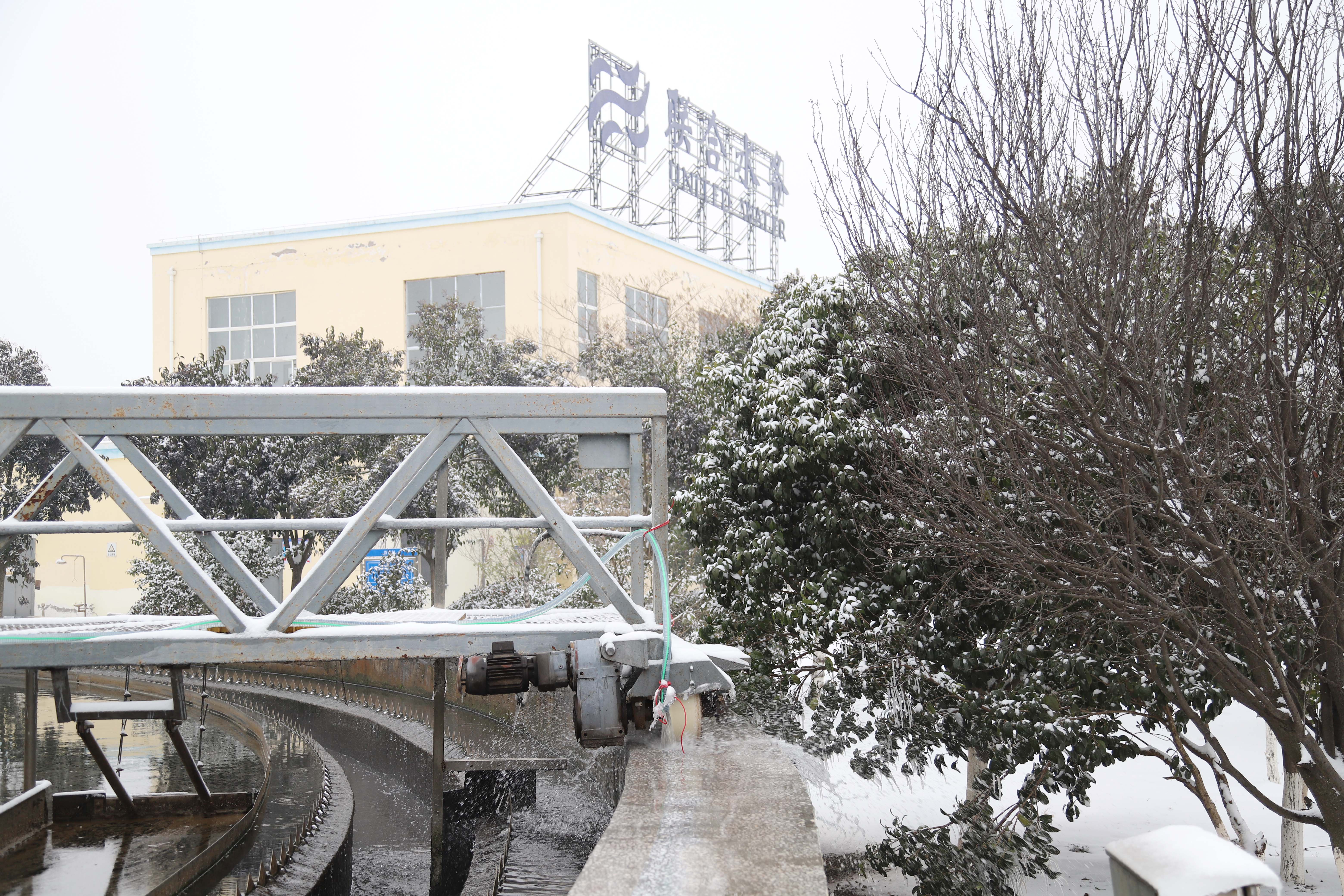 污水處理工作不僅關(guān)系著生態(tài)環(huán)境,也是關(guān)系著千家萬戶的民生大事,寒潮天氣下,隨州公司生產(chǎn)人員冒著風(fēng)雪進行重點地巡檢,通過巡檢觀察污水處理廠各工藝單元的感官現(xiàn)象和指標(biāo),初步判斷水質(zhì)的變化和運行是否正常、穩(wěn)定,重點設(shè)備是否正常運行。在巡檢的過程中,生產(chǎn)人員發(fā)現(xiàn)一期四座二沉池下方輪子出現(xiàn)打滑空轉(zhuǎn),二沉池運轉(zhuǎn)停止的情況。雪落在行走軌道上,被行走輪壓實后,形成雪層,造成行走輪的打滑,使刮泥機長時間在一個位置運行,池底的污泥無法全部排出,造成工藝運行的異常,需要及時清理干凈軌道表面的冰層。發(fā)現(xiàn)問題后,生產(chǎn)各部門緊急召開臨時會議,制定解決方案,最終決定安裝水泵,從池子抽水澆注在軌上道,保障軌道正常運行。