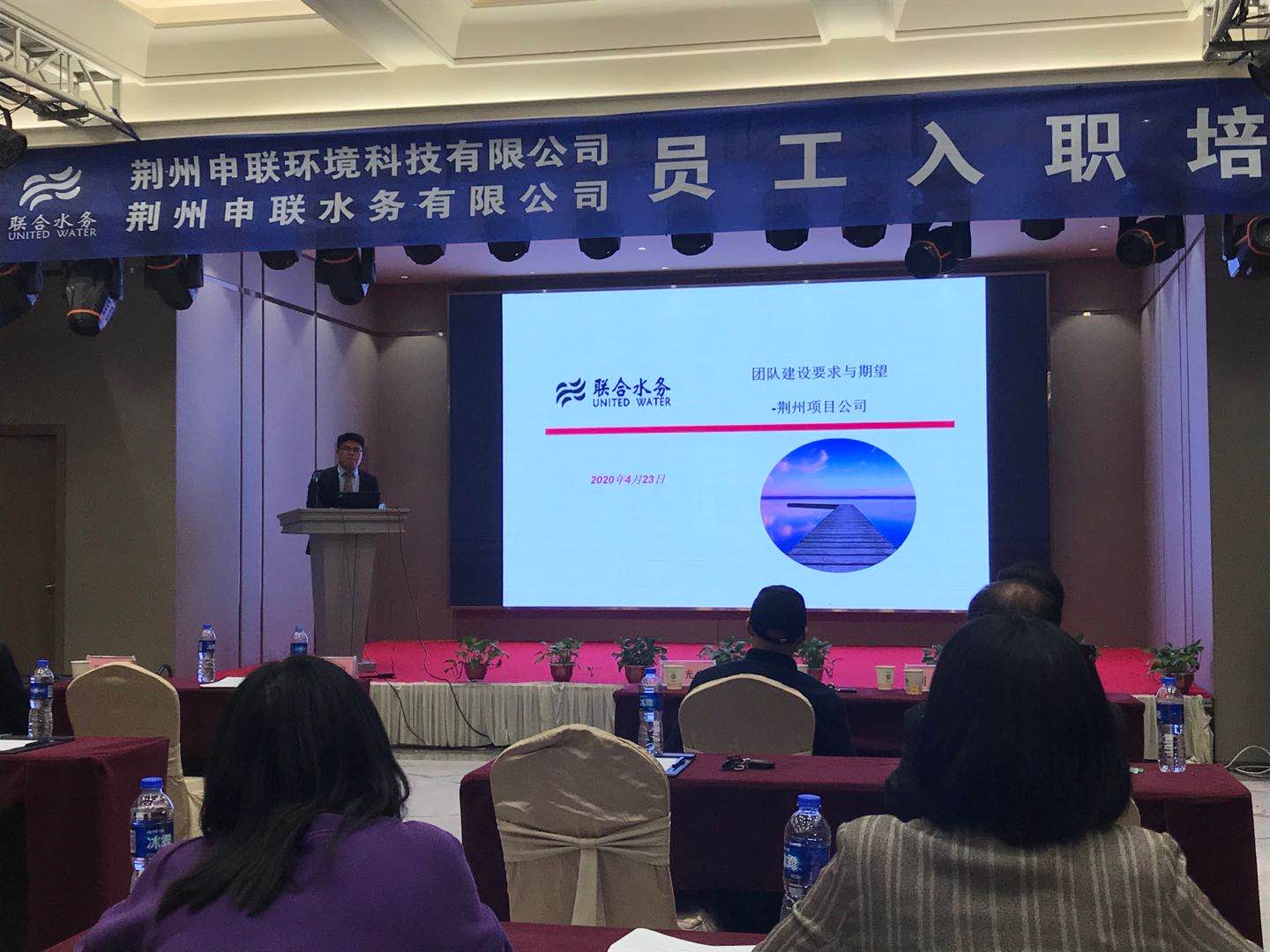 2020年1月17日聯(lián)合水務集團公司正式簽約荊州經(jīng)開區(qū),取得了荊州經(jīng)濟技術開發(fā)區(qū)的工業(yè)污水項目特許經(jīng)營權及生活污水項目的25年特許經(jīng)營權,至此,荊州申聯(lián)環(huán)境科技有限公司、荊州申聯(lián)水務有限公司(以下簡稱“荊州申聯(lián)公司”)正式成立。 為幫助全體員工全面了解集團概況及企業(yè)文化,營造奮發(fā)向上、團結協(xié)作的工作氛圍,幫助全體員工更好的適應新機制、新環(huán)境、新崗位,4月22日至23日在荊州市盟達酒店二樓多功能會議廳開展了荊州申聯(lián)公司員工入職培訓。會議由咸寧聯(lián)合水務有限公司人力資源部經(jīng)理陳紅主持,荊州申聯(lián)公司總經(jīng)理許應濤,咸寧聯(lián)合水務有限公司人事行政副總經(jīng)理張偉華、咸寧思源水務有限公司常務副總經(jīng)理施政云、宿遷耿車污水處理廠廠長趙祥祥等聯(lián)合水務集團旗下多個項目公司高管及荊州申聯(lián)公司各部門員工共計40余人參加了培訓。