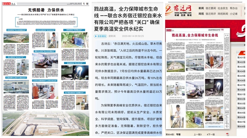 圖為《宿遷日報(bào)》、“速新聞”、“宿遷網(wǎng)”刊登宣傳 制作高峰供水電視宣傳片,加深用戶直觀感受。今年的高峰供水宣傳增添了一大亮點(diǎn),即由地方電視臺節(jié)目組深入供水一線錄制、播出宣傳。經(jīng)過長時間籌劃、宣傳片腳本的反復(fù)修訂、領(lǐng)導(dǎo)審核,歷時一個多月,公司高峰供水宣傳片在宿遷綜合頻道、公共頻道播出,引起了很大反響。電視節(jié)目的播出,將供水的工作場景直觀展現(xiàn)在用戶面前,充分體現(xiàn)了供水人不畏酷暑、力保供水的可貴精神,獲得社會高度認(rèn)可。