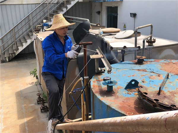 顧振賢 驕陽(yáng)下的焊接作業(yè),設(shè)備維修時(shí)不我待。接到生產(chǎn)巡檢人員的報(bào)修信息,需要焊接作業(yè),正午的點(diǎn),驕陽(yáng)炙烤。桐鄉(xiāng)污水公司機(jī)電部機(jī)修工沈新學(xué)可顧不了那么多,設(shè)備安全事關(guān)生產(chǎn)安全,維修一刻也不能等。抓起一簾草帽,背起焊接工具箱,直奔維修點(diǎn)。駕輕就熟,開(kāi)始作業(yè),汗珠一顆顆從臉頰、身上滾落,一刻也不曾停歇。
