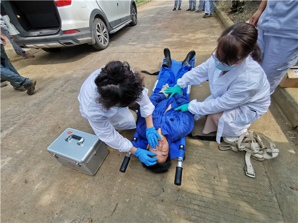 圖2:應(yīng)急演練現(xiàn)場(chǎng)--醫(yī)護(hù)人員查看傷員情況 總指揮迅即趕到事故地點(diǎn)統(tǒng)籌指揮,應(yīng)急小組多措并舉,疏散現(xiàn)場(chǎng)閑雜人員、布置警戒線、通知救援小組展開(kāi)救護(hù)工作、撥打120急救電話,各項(xiàng)工作緊張而有序開(kāi)展。救援隊(duì)長(zhǎng)了解事故大致情況后,安排人員在現(xiàn)場(chǎng)安裝大功率通風(fēng)設(shè)備進(jìn)行通風(fēng)處理,并開(kāi)展初期救援,2分鐘后,公司專業(yè)救援人員佩戴便攜式防毒面具、安全帶,攜帶檢測(cè)儀器、對(duì)講機(jī),連接救生索,入池檢測(cè)氣體濃度,評(píng)估下池救援的可行性。在確認(rèn)可以施救的情況下,將傷員轉(zhuǎn)移至池外通風(fēng)空曠處,隨即按標(biāo)準(zhǔn)心肺復(fù)蘇手法實(shí)施搶救,直至120救護(hù)車趕到。專業(yè)醫(yī)護(hù)人員查看傷員情況后將其轉(zhuǎn)移至救護(hù)車上,送往醫(yī)院搶救治療。至此,經(jīng)過(guò)精心策劃、周密安排的應(yīng)急演練圓滿落下帷幕。