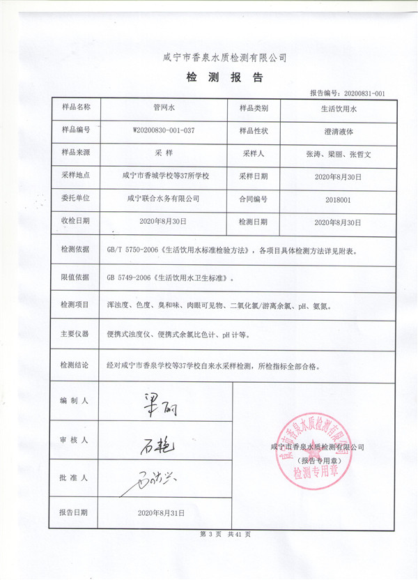 圖:城區(qū)37所學(xué)校水質(zhì)檢測(cè)報(bào)告 本次被檢測(cè)的37所學(xué)校,現(xiàn)場(chǎng)檢測(cè)渾濁度和游離余氯(二氧化氯)指標(biāo)均合格,帶回實(shí)驗(yàn)室檢測(cè)的項(xiàng)目,色度均≤5鉑鈷色度單位,無異臭、異味,pH值和氨氮指標(biāo)均符合國(guó)家標(biāo)準(zhǔn)。 咸寧市香泉水質(zhì)檢測(cè)有限公司負(fù)責(zé)人說:“經(jīng)過對(duì)采集的水樣檢測(cè),咸寧城區(qū)由聯(lián)合水務(wù)供水的37所學(xué)校,水質(zhì)符合《生活飲用水衛(wèi)生標(biāo)準(zhǔn)》GB 5749-2006國(guó)家標(biāo)準(zhǔn)及相關(guān)要求,可放心飲用”。 專業(yè)精細(xì) 保證檢測(cè)結(jié)果精準(zhǔn)權(quán)威 今年由于新冠肺炎疫情影響,我市學(xué)校自來水已有大半年時(shí)間未正常使用,水管內(nèi)多少會(huì)積攢未流通的“死水”。為確保本次開學(xué)季校園水質(zhì)檢測(cè)結(jié)果精準(zhǔn),咸寧聯(lián)合水務(wù)校園水質(zhì)采樣專班人員,每到一所學(xué)校都會(huì)在學(xué)校食堂、宿舍水龍頭和消防栓前駐足許久,將自來水龍頭打開后,至少放水5-10分鐘才將自來水采樣或現(xiàn)場(chǎng)檢測(cè)。 盡管驕陽似火,但工作人員卻一絲不茍。為確保高效完成本次檢測(cè)任務(wù),校園水質(zhì)采樣專班在水質(zhì)采集成功后,第一時(shí)間送往咸寧市香泉水質(zhì)檢測(cè)有限公司,分區(qū)作戰(zhàn)、多組協(xié)同,做到應(yīng)檢盡檢,不漏一校。 香泉水檢公司將送達(dá)的水樣連夜開展檢測(cè),檢測(cè)人員繃緊每一根神經(jīng),不同校區(qū)和不同采水點(diǎn)的量杯,都需認(rèn)真做好標(biāo)記;每一個(gè)參數(shù)和指標(biāo)都要仔細(xì)反復(fù)地觀察、檢測(cè),只有做到謹(jǐn)小慎微,才可保證檢測(cè)結(jié)果準(zhǔn)確無誤。 據(jù)悉,香泉水檢公司是咸寧市生活飲用水水質(zhì)檢測(cè)能力最強(qiáng)的專業(yè)檢測(cè)機(jī)構(gòu)。具有生活飲用水106項(xiàng)中94個(gè)項(xiàng)目檢測(cè)能力,取得資質(zhì)的水質(zhì)參數(shù)達(dá)101項(xiàng),作為湖北省城市供水水質(zhì)監(jiān)測(cè)網(wǎng)成員單位,其飲用水檢測(cè)能力處于湖北省供水行業(yè)第二位。本次被測(cè)37所學(xué)校,香泉水質(zhì)檢測(cè)公司統(tǒng)一出具權(quán)威性的水質(zhì)檢測(cè)報(bào)告。 上門納諫 踐行“店小二”服務(wù)精神 上門納諫提升服務(wù),踐行“店小二”服務(wù)精神。除了對(duì)水質(zhì)進(jìn)行采集和檢測(cè),咸寧聯(lián)合水務(wù)組織二次供水運(yùn)營(yíng)部,積極主動(dòng)與各學(xué)校對(duì)接,將《關(guān)于我市開學(xué)前學(xué)校用水安全溫馨提示》送到學(xué)校,并對(duì)學(xué)校的供水設(shè)施進(jìn)行檢查、維護(hù)。