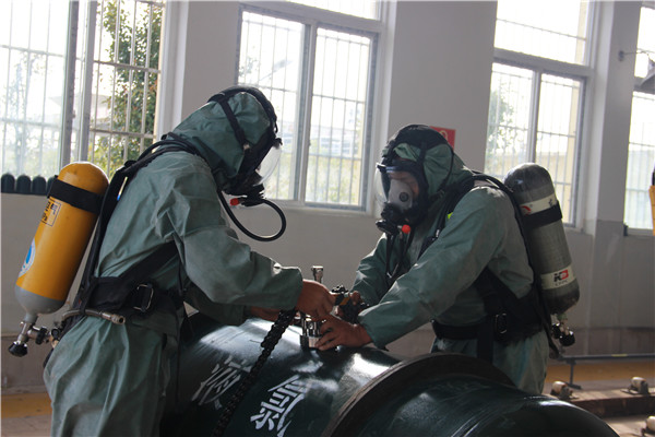 圖:氯氣泄漏演練現(xiàn)場(chǎng) 隨著一陣警鈴聲響起,液氯泄漏應(yīng)急演練活動(dòng)正式開(kāi)始。水廠值班人員發(fā)現(xiàn)加氯間內(nèi)有煙霧彌漫,在確定是氯氣泄漏后,水廠負(fù)責(zé)人立即向分管生產(chǎn)領(lǐng)導(dǎo)付總匯報(bào),并拉好警戒線迅速疏散職工撤離到安全地帶。在付總的指示下,立即啟動(dòng)《王英水廠氯氣泄漏預(yù)案》指令,搶修組成員在穿戴防化服和正壓式空氣呼吸器進(jìn)入氯庫(kù)進(jìn)行查漏處置,對(duì)泄漏儲(chǔ)罐進(jìn)行泄壓、堵漏、倒罐,經(jīng)過(guò)3分鐘左右的緊急有序搶修,氯氣泄漏事故得到妥善處理。