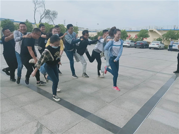 圖1:投飛鏢 “投飛鏢”活動結(jié)束,大家意猶未盡,顧不上休息,馬上投入下一個團(tuán)體項目單腳火車跑:7人排成一列,每人僅用右腳支撐。后一人右手搭前一人肩,左手托住前一人左腳,多隊并排一起站在起跑線上。裁判發(fā)令后各隊齊出,賽程為20米,用時少者為優(yōu)勝隊,每次每個參賽隊至少有2名女隊員參加,比賽過程中腳掉下來的隊伍為犯規(guī),將失去比賽資格。這是一個考驗團(tuán)隊協(xié)作的項目,大家需步調(diào)一致才能順利快速前行。比賽過程中,姿態(tài)百出,前仰后合,笑料百出,趣味十足。能順利前行的隊幾乎沒有,均困難重重,甚至有幾個隊剛一出戰(zhàn)便有人跌倒,不氣餒,顧不上疼痛,迅速爬起來調(diào)整隊形再出發(fā)。最終財務(wù)部組隊贏得了冠軍。