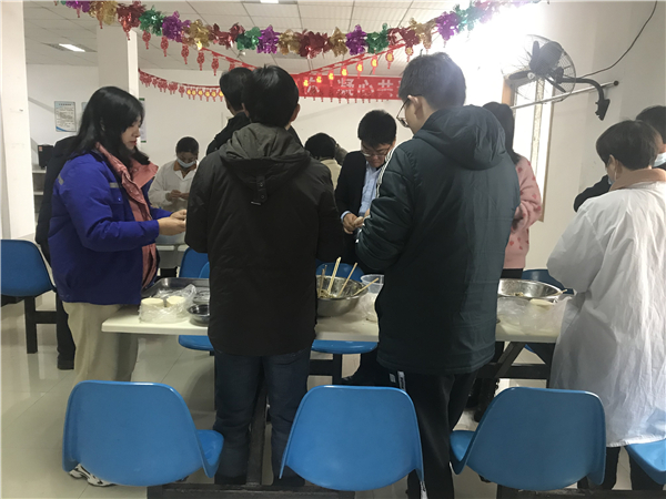 25日上午,總經(jīng)理許應(yīng)濤帶領(lǐng)各部門(mén)員工在公司食堂開(kāi)展包餃子活動(dòng),為公司全體員工準(zhǔn)備餃子午餐。員工們?cè)谑程脦煾档闹笇?dǎo)下,攤放一張餃子皮于手掌、用筷子夾餃子餡、用手指蘸水抹在餃子皮周?chē)、?duì)折餃子皮、用力將餃子皮捏緊。大家邊包邊交流經(jīng)驗(yàn),現(xiàn)場(chǎng)氣氛融洽而熱烈。盡管有些餃子包得奇形怪狀,但卻承載了員工們滿(mǎn)滿(mǎn)的愛(ài)意和感恩之情,中午12點(diǎn),大家齊心協(xié)力完成了近2000個(gè)感恩餃子的職工午餐。