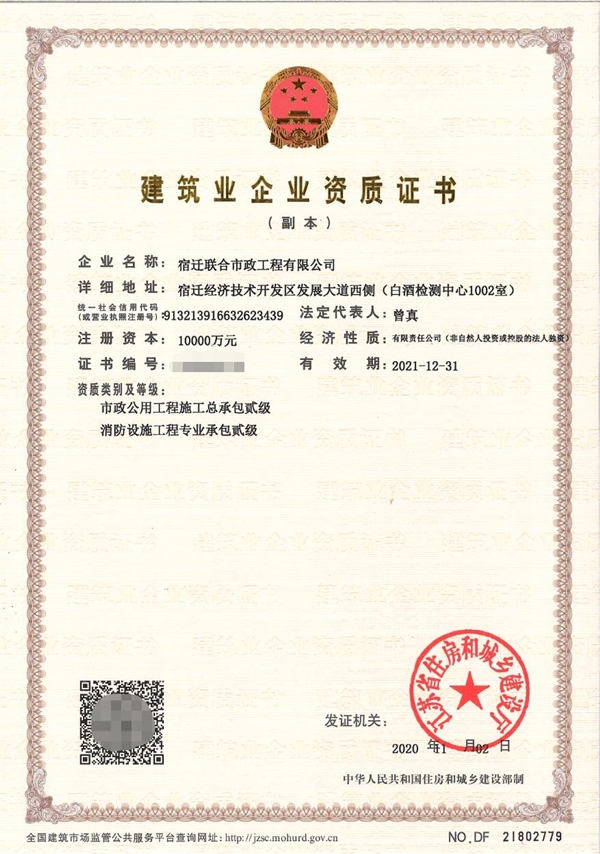 近日,宿遷聯(lián)合市政工程有限公司成功取得了新一期安全生產(chǎn)許可證,標志著公司市政公用工程資質(zhì)證書延續(xù)換證工作圓滿完成。