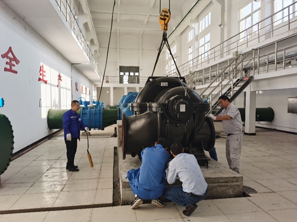 經(jīng)過設(shè)備選型、采購、安裝配件整理系列工作完成后,近期完成了新裝機組的調(diào)試,并投入運行。新增的送水泵機組送水流量為3100m3/h。整個安裝工程分為機組水泥地基制作、機組的安裝尺寸定位、進(jìn)出水管的焊接施工、動力電纜、控制電纜接線檢測。高精度的安裝效果才能保證今后的長久平穩(wěn)運行,機電設(shè)備部動用部門全部資源,為新機組的安裝竭盡所能。