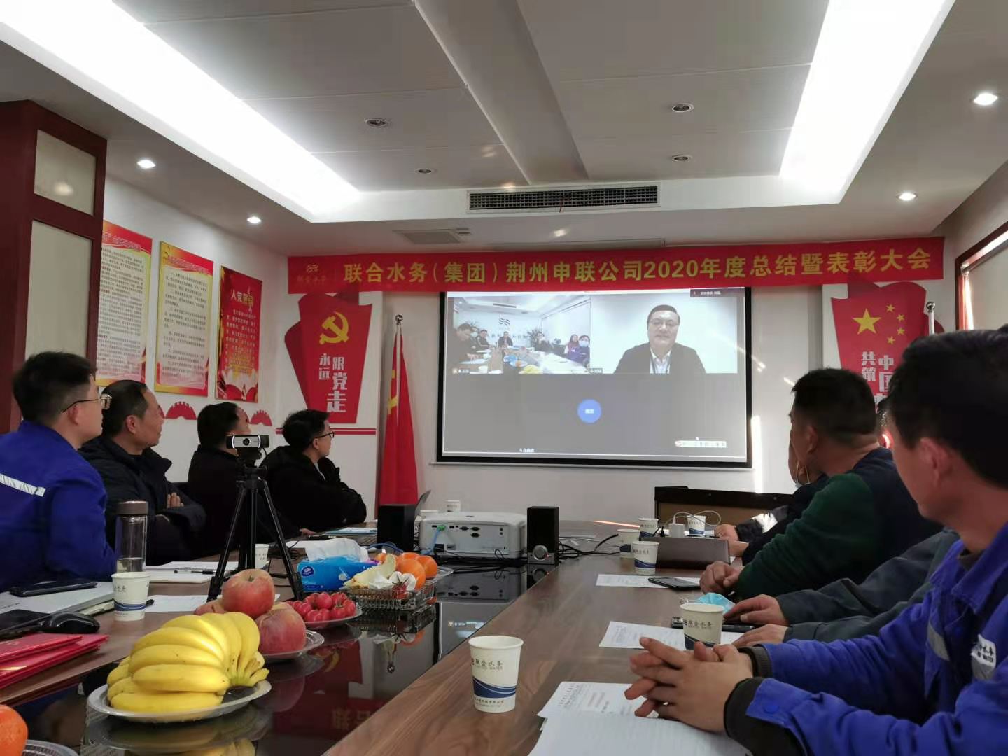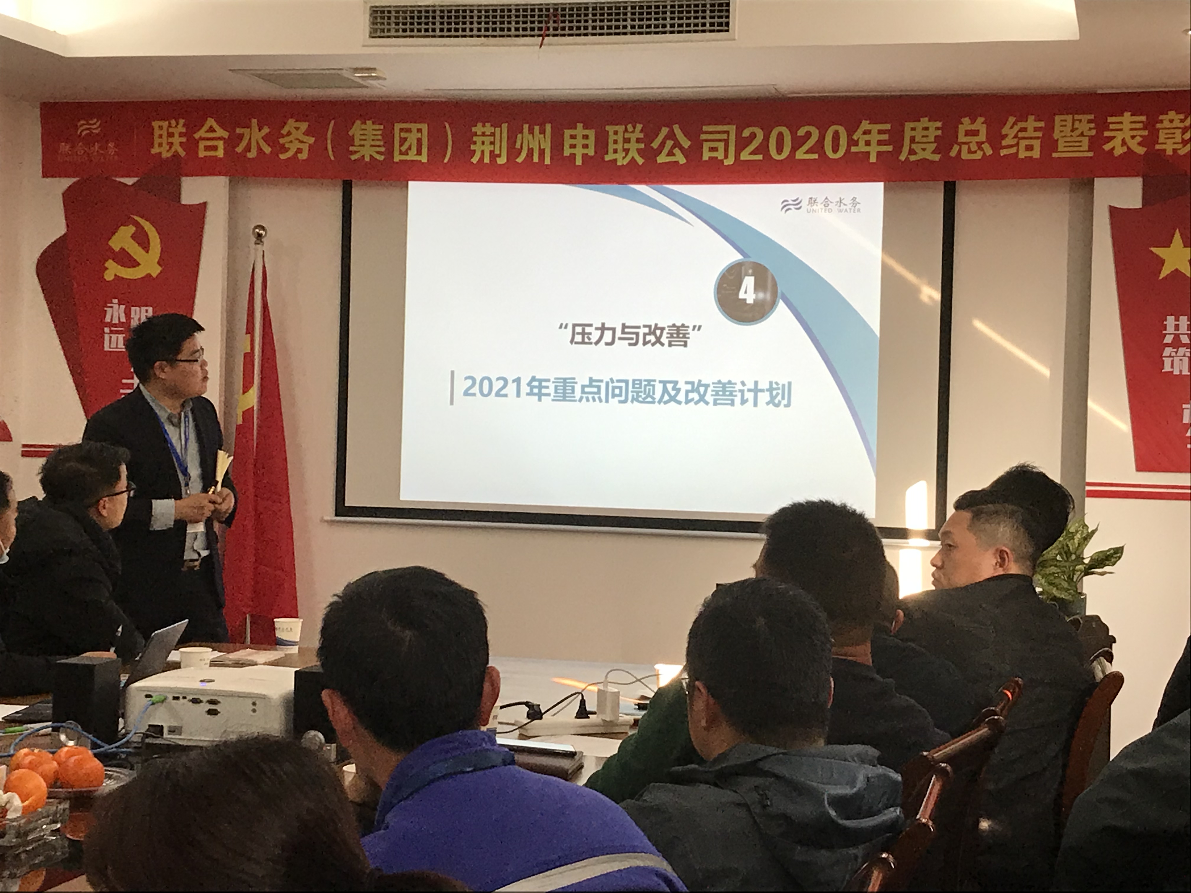 “玉鼠載譽(yù)辭舊歲,金牛報(bào)喜迎新春”。2月5日,荊州申聯(lián)公司召開(kāi)以“共克時(shí)艱、開(kāi)創(chuàng)未來(lái)”為主題的2020年工作總結(jié)暨表彰大會(huì),會(huì)議全面回顧2020年主要工作,分析不足,總結(jié)經(jīng)驗(yàn),安排部署2021年目標(biāo)任務(wù)。聯(lián)合水務(wù)集團(tuán)董事兼高級(jí)副總裁劉猛以及荊州申聯(lián)公司主管級(jí)以上人員、先進(jìn)員工、員工代表共計(jì)26人參加了會(huì)議,會(huì)議由人事行政副總經(jīng)理劉斌主持。為加強(qiáng)疫情防控工作,會(huì)議采取“現(xiàn)場(chǎng)+視頻直播”的方式進(jìn)行。