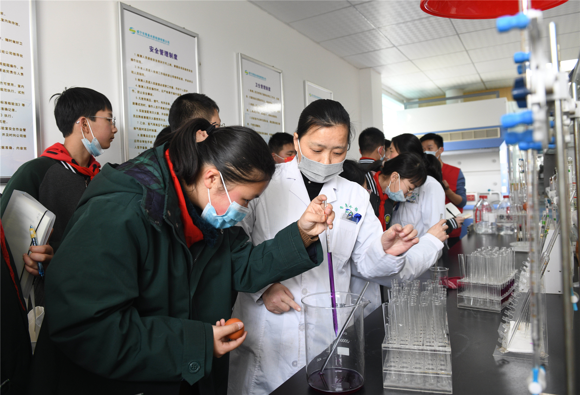 圖:參觀平流沉淀池 在參觀完制水工藝流程后,同學(xué)們來到了水質(zhì)檢測中心。工作人員介紹到,現(xiàn)階段公司擁有50多臺套檢測儀器設(shè)備,檢測項(xiàng)目達(dá)到100余項(xiàng),其檢測能力在湖北省位于第二名,為確保出廠的每一滴水都是達(dá)標(biāo)之水、優(yōu)質(zhì)之水,工作人員會每隔兩小時對出廠水進(jìn)行檢測一次,全力保障龍頭水源安全。