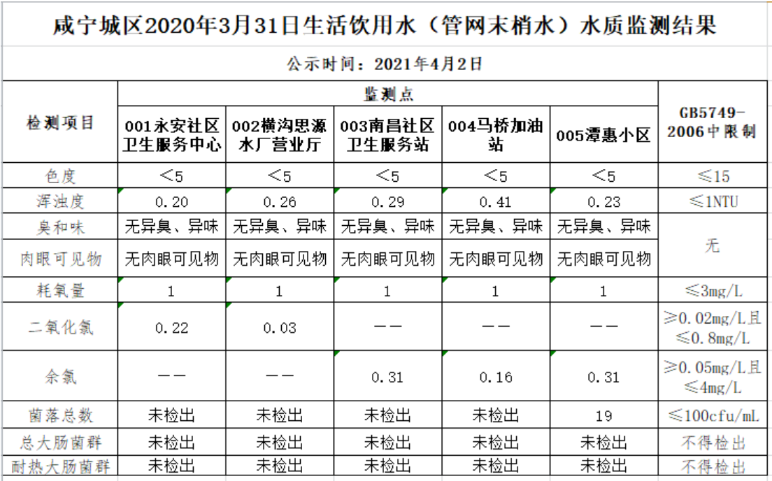 圖:市衛(wèi)健委公示管網(wǎng)末梢水監(jiān)測(cè)結(jié)果 除了省城市供水水質(zhì)監(jiān)測(cè)網(wǎng)的季度抽查,咸寧市衛(wèi)計(jì)委、市住建局和市生態(tài)環(huán)境局,分別作為市級(jí)主管部門對(duì)咸寧聯(lián)合水務(wù)供水水質(zhì)進(jìn)行月檢、半月檢及日檢。市疾控中心每月對(duì)水源水、出廠水水質(zhì)進(jìn)行常規(guī)42項(xiàng)檢測(cè),每天對(duì)管網(wǎng)末梢水水質(zhì)進(jìn)行7項(xiàng)指標(biāo)監(jiān)測(cè),其結(jié)果在咸寧市衛(wèi)計(jì)委網(wǎng)站公開發(fā)布;市住建局每半年對(duì)各出廠水水質(zhì)進(jìn)行常規(guī)42項(xiàng)督查;市生態(tài)環(huán)境局對(duì)各水廠飲用水水源水質(zhì)進(jìn)行實(shí)時(shí)在線監(jiān)測(cè)。