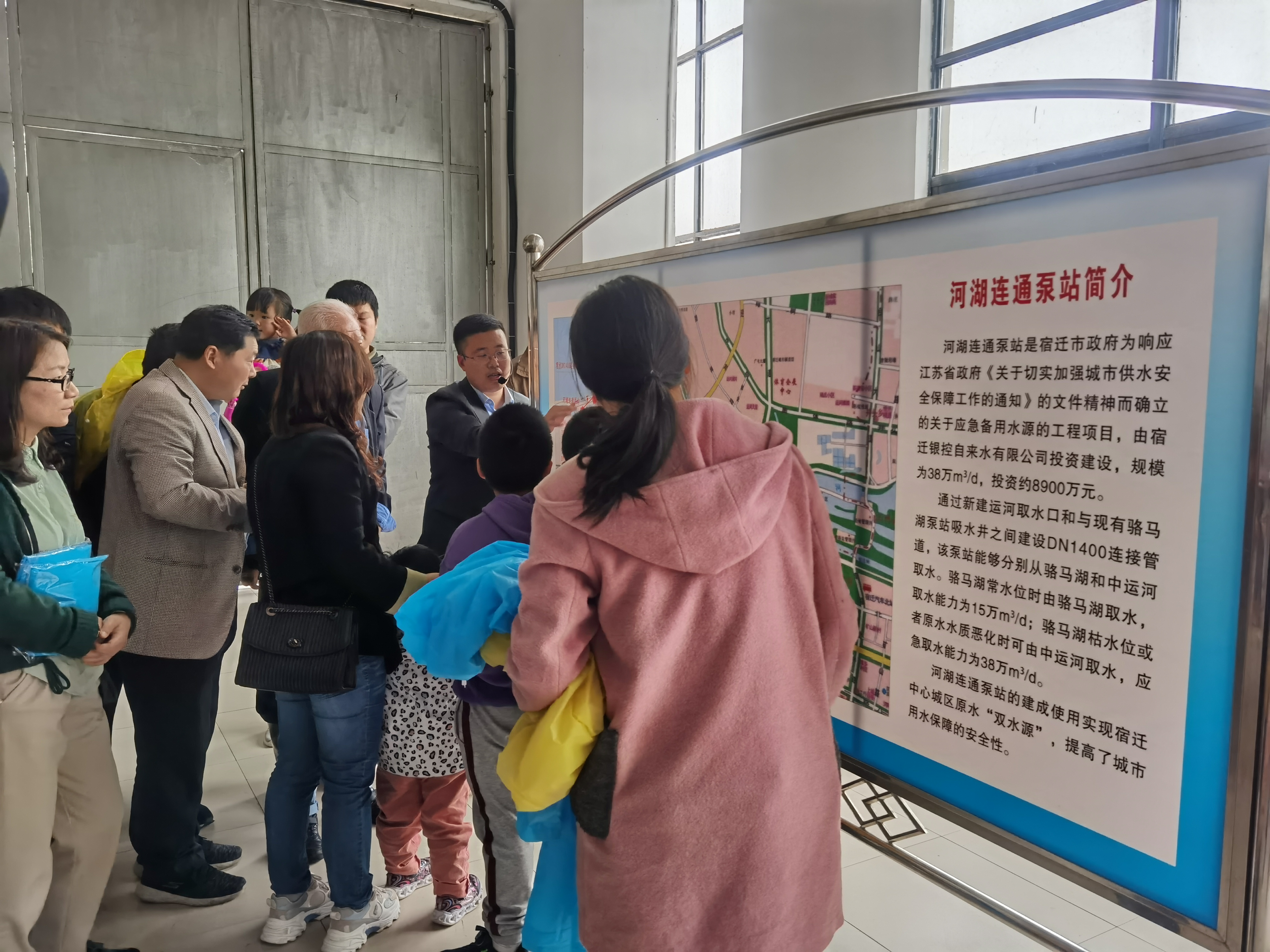 水是生命之源,彌足珍貴,節(jié)約用水是人類永恒的主題。今年5月11日—16日是我國第30個(gè)“城市節(jié)約用水宣傳周”,今年的主題是“貫徹新發(fā)展理念,建設(shè)節(jié)水型城市”。為大力宣揚(yáng)節(jié)水理念,增強(qiáng)市民節(jié)水意識(shí),5月15日,聯(lián)合水務(wù)宿遷供水公司與市住房和城鄉(xiāng)建設(shè)局、宿遷日報(bào)社共同舉辦了“一滴水的旅程”水廠開放日直播活動(dòng)。參加活動(dòng)的有熱心的市民代表、學(xué)生代表,還有市綠色環(huán)保協(xié)會(huì)的志愿者們,共計(jì)40余人。 小雨紛飛,依然沒能阻擋大家探秘自來水的高漲熱情。上午8:30,從宿遷日報(bào)社集中乘車出發(fā),大家一路歡聲笑語,直奔第一站——駱馬湖飲用水源地。途中,市住房和城鄉(xiāng)建設(shè)局供排水中心朱泉主任為大家分享了一些節(jié)水小知識(shí),孩子們踴躍提問,增長了節(jié)水知識(shí)和認(rèn)識(shí)。到達(dá)駱馬湖水源地,望向浩瀚飄渺的駱馬湖,煙霧縈繞,一望無際,大家紛紛表示駱馬湖是宿遷人的母親湖,保護(hù)水源,就是保護(hù)城市命脈。在河湖連通原水泵站,大家參觀了送水泵房,聽取了該泵站的詳細(xì)介紹。