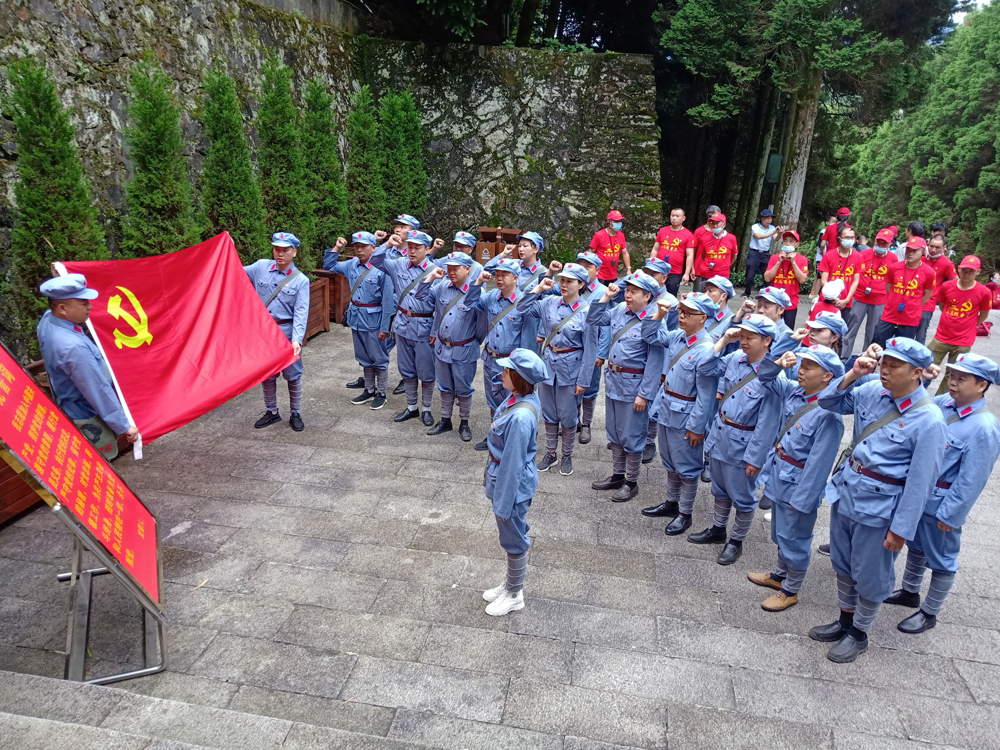 重溫黨的誓詞 在海拔1343米巍峨峻拔、地勢險要的黃洋界哨口,著名的黃洋界保衛(wèi)戰(zhàn)就發(fā)生在這里,毛大家身臨其境,在講解員的解說中,依稀聽到當(dāng)年隆隆炮聲,更進(jìn)一步認(rèn)知到革命先烈堅定的理想信念、勇于犧牲的崇高品質(zhì)。 在井岡山革命烈士陵園,黨員同志們懷著無比崇敬的心情,走在這片被革命先烈用鮮血和生命染紅的土地上,向革命先烈們敬獻(xiàn)花圈,并再一次莊嚴(yán)地舉起右手,面對黨旗,重溫入黨誓詞,領(lǐng)悟了一種精神──井岡山精神,這種精神不但是革命勝利的根源,同樣也是實行改革開放、現(xiàn)代化建設(shè)取得成功的一個根源。