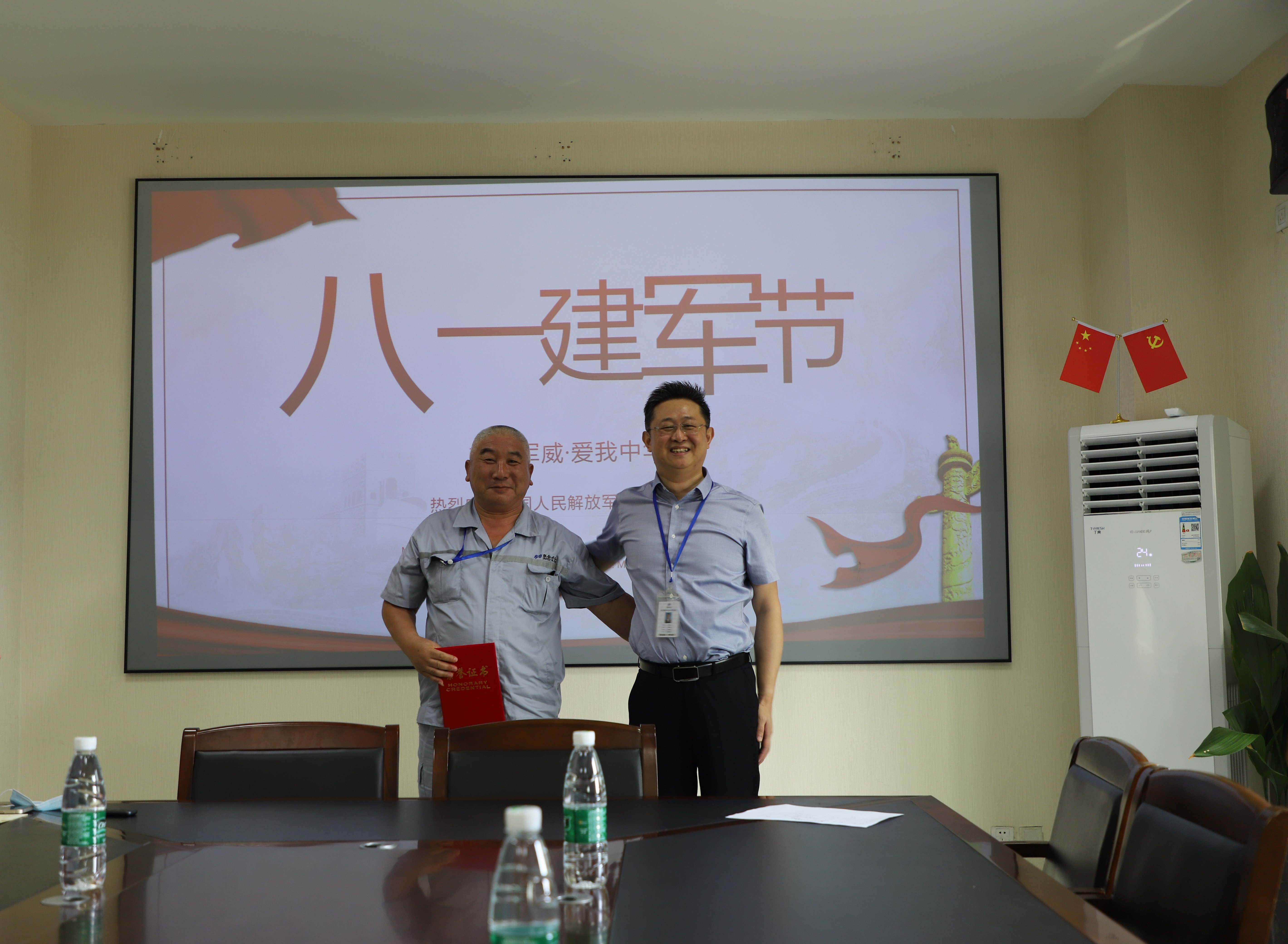 為慶祝即將到來的“八一建軍節(jié)”,江蘇聯(lián)合水務(wù)科技股份有限公司宿遷公司組織退伍在職員工開展慶祝“八一建軍節(jié)”活動(dòng)。退伍不褪色,換裝不換心,曾經(jīng),錚錚鐵骨戰(zhàn)沙場(chǎng),保家衛(wèi)國,而今,盡心竭力保供水,守衛(wèi)家園生命線。在這特殊的節(jié)日,向公司四十三名退伍軍人在職員工致敬!向全國光榮的軍人致敬! 7月30日上午,在公司二水廠二樓會(huì)議室,退伍軍人員工代表近20人集聚一堂。首先,也曾經(jīng)一身戎裝的公司客服運(yùn)營副總經(jīng)理尹邦交,代表公司為評(píng)選出的五位“最美退役軍人”——周允勝、孟慶葉、韓江、臧十偉、馬強(qiáng)頒發(fā)了榮譽(yù)證書,對(duì)他們不忘軍人本色,繼續(xù)發(fā)揚(yáng)軍人不怕苦、不怕累的精神,在平凡的供水崗位上忘我奉獻(xiàn)的高尚品質(zhì)給予了充分肯定。