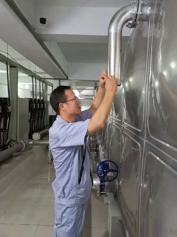 圖:檢查泵房水箱 多措并舉調(diào)配,穩(wěn)定居民供水。當(dāng)前,聯(lián)合水務(wù)宿遷公司采用的二次供水方式有兩種,分別是管網(wǎng)疊壓的無負(fù)壓供水、低位水箱加變頻調(diào)速供水。根據(jù)小區(qū)建筑設(shè)計(jì),因地制宜采用相匹配的供水方式,既節(jié)省能源又持續(xù)穩(wěn)定保障供水。通過多種方式并用,加強(qiáng)巡檢,降低設(shè)備故障率,保障了恒壓供水,獲得用戶一致好評(píng)。