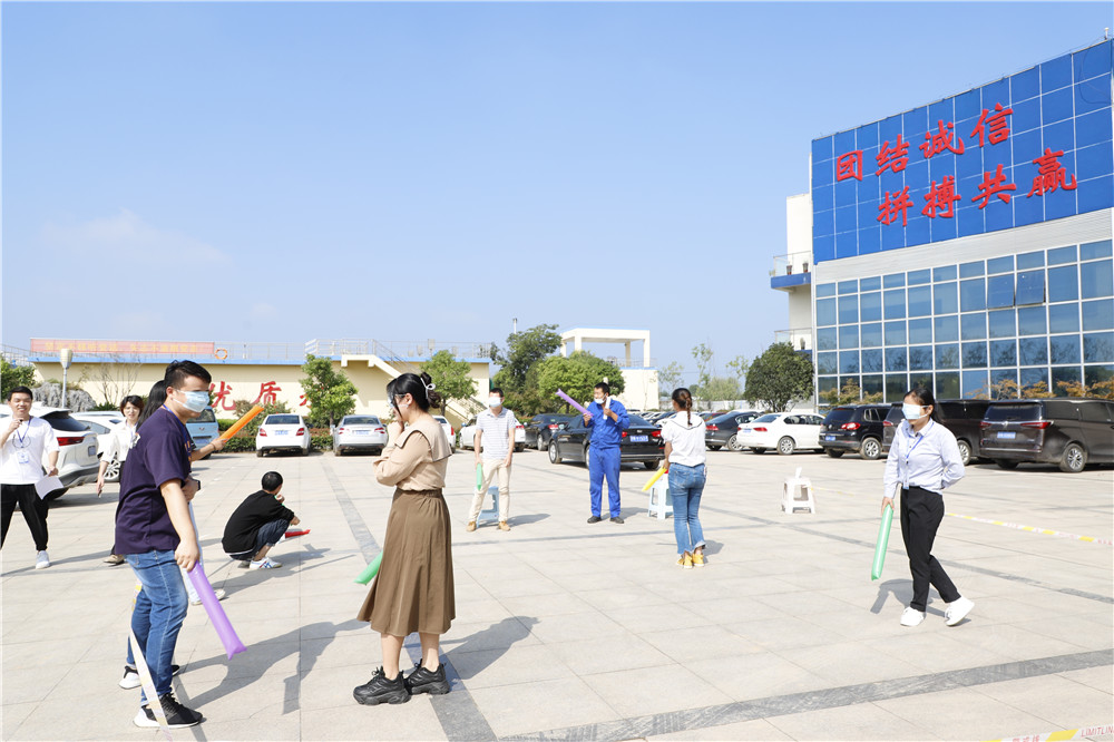 金秋時(shí)節(jié),舉國(guó)歡騰,禮贊華誕。在偉大祖國(guó)72歲生日到來之際,9月29日,聯(lián)合水務(wù)宿遷公司組織開展了一年一度的員工趣味活動(dòng)。來自公司各分公司、各部門的200多名員工參與了各項(xiàng)賽事的角逐,公司總經(jīng)理曾真、人事行政副總經(jīng)理陳少軍、宿遷聯(lián)合市政工程有限公司總經(jīng)理梁丹、客服運(yùn)營(yíng)副總經(jīng)理尹邦交、生產(chǎn)技術(shù)副總經(jīng)理趙軍等公司領(lǐng)導(dǎo)親臨現(xiàn)場(chǎng),為參賽選手們加油、助威。 行政管理部提前進(jìn)行了精心籌劃和準(zhǔn)備,從做活動(dòng)方案、甄選活動(dòng)項(xiàng)目、獎(jiǎng)品等,只為給國(guó)慶節(jié)帶來更加濃烈的喜慶氣氛、為公司全體員工帶來更多的歡樂。今年的員工趣味活動(dòng)共4個(gè)項(xiàng)目,2個(gè)趣味性極強(qiáng)、參與度廣的個(gè)人項(xiàng)目投飛鏢和蒙眼打棒球以及雙人項(xiàng)目踩氣球和傳統(tǒng)項(xiàng)目拔河。上午舉行的是單人項(xiàng)目投飛鏢和蒙眼打棒球,下午舉行的是踩氣球和拔河,活動(dòng)主場(chǎng)安排在辦公樓前廣場(chǎng),大紅燈籠高高掛,火紅的橫幅拉起來,國(guó)慶節(jié)氛圍營(yíng)造,讓人激情澎湃,辦公樓上“團(tuán)結(jié)、誠(chéng)信、拼搏、共贏”的企業(yè)精神催人奮進(jìn)。 上午9:00,秋意正濃,神清氣爽,活動(dòng)正式拉開序幕。第一個(gè)項(xiàng)目是單人項(xiàng)目投飛鏢。參賽選手不分男女,投鏢距離3米,每人投3次,三次成績(jī)累計(jì)為個(gè)人總成績(jī)。由于報(bào)名人數(shù)眾多,比賽分兩個(gè)隊(duì)同時(shí)進(jìn)行,大家秩序井然,高手每一次投擲都直逼靶心,引來掌聲不斷;也不乏投偏、投歪的,任他做足準(zhǔn)備,竟難中一環(huán),那飛鏢就是不聽使喚,七拐八彎就是不往靶上去,有恨恨地飛到樹上的,也有直飛入草坪的,引來陣陣哄笑,好不熱鬧。最終,洋河服務(wù)中心的仇實(shí)以27環(huán)的總成績(jī)摘得該項(xiàng)目桂冠。