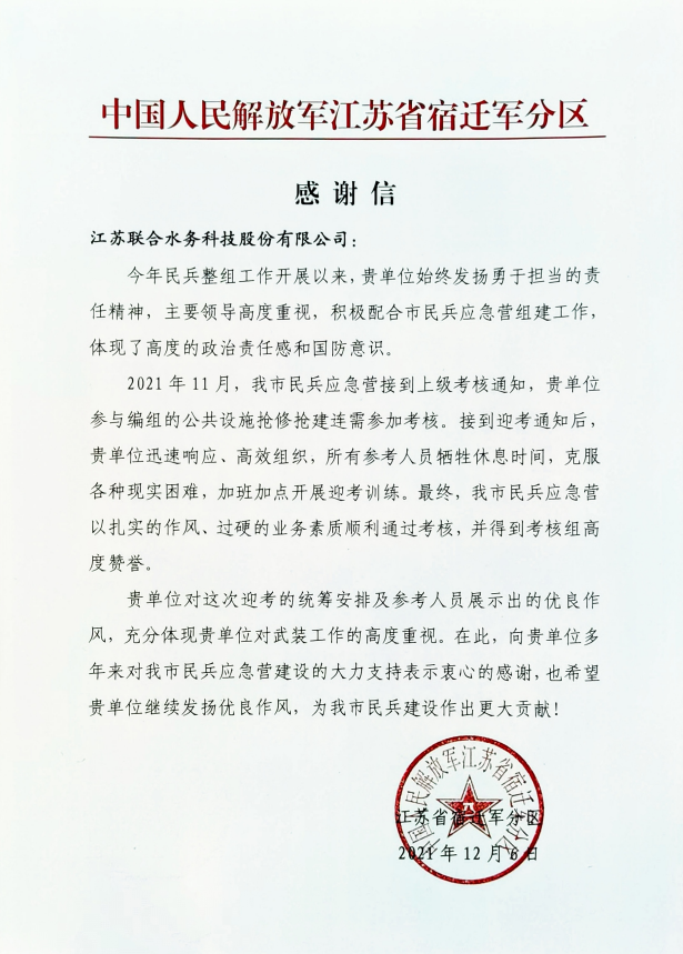 近日,江蘇省宿遷軍分區(qū)開展民兵年度考核驗收工作,經(jīng)過一天的考核,江蘇聯(lián)合水務(wù)科技股份有限公司最終以扎實的作風(fēng)、過硬的業(yè)務(wù)素質(zhì)順利通過省、市兩級驗收和考核。考核結(jié)束后,宿遷軍分區(qū)向公司發(fā)來感謝信,感謝聯(lián)合水務(wù)多年來對宿遷市民兵應(yīng)急營建設(shè)的大力支持。