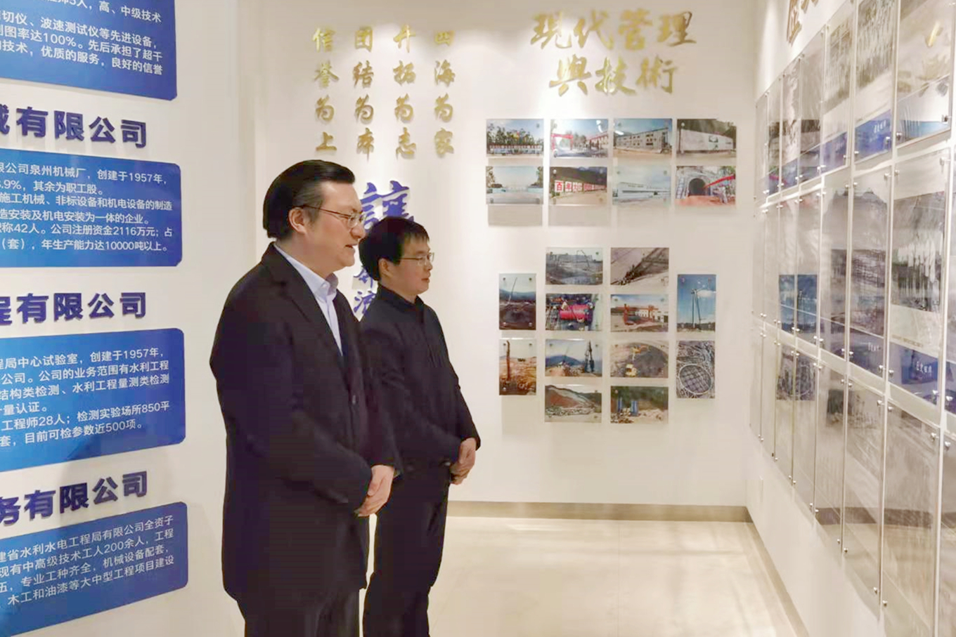 會前,劉總一行在福建省水利水電工程局有限公司總經(jīng)理助理楊世杰及經(jīng)營部經(jīng)理馬碧山的陪同下,參觀了福建水利建設(shè)成就展覽館,馬經(jīng)理向劉總詳細(xì)介紹了福建水利一路走來的發(fā)展歷程以及取得的相關(guān)成就,劉總對合作單位取得的成就由衷祝賀,并表示對今后聯(lián)合水務(wù)和福建水利強(qiáng)強(qiáng)聯(lián)合充滿期待。