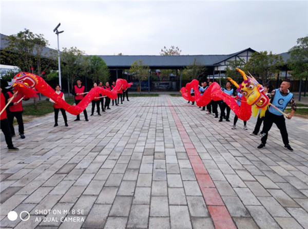 圖/ “鼓動人心”活動現(xiàn)場 最后一個(gè)項(xiàng)目是“龍騰盛世”。所有人齊心協(xié)力將零件組裝成一條活靈活現(xiàn)的龍,并在教練的指導(dǎo)下完成龍騰四海、盤龍?jiān)坪<坝锡垜蛩齻(gè)動作。這是一個(gè)大型創(chuàng)作類項(xiàng)目,趣味性和團(tuán)隊(duì)合作性極強(qiáng)。大家各司其職,制作龍骨、畫龍鱗、粘龍頭龍尾,不到一刻鐘的時(shí)間,兩條游龍就制作完成。在舞龍環(huán)節(jié),大家專心聽、用心舞,兩隊(duì)的舞龍動作都得到了教練的高度贊揚(yáng)。最后,在教練“風(fēng)水越來越順、生活越來越好”的祝福中結(jié)束了愉快而充實(shí)的團(tuán)建拓展活動。